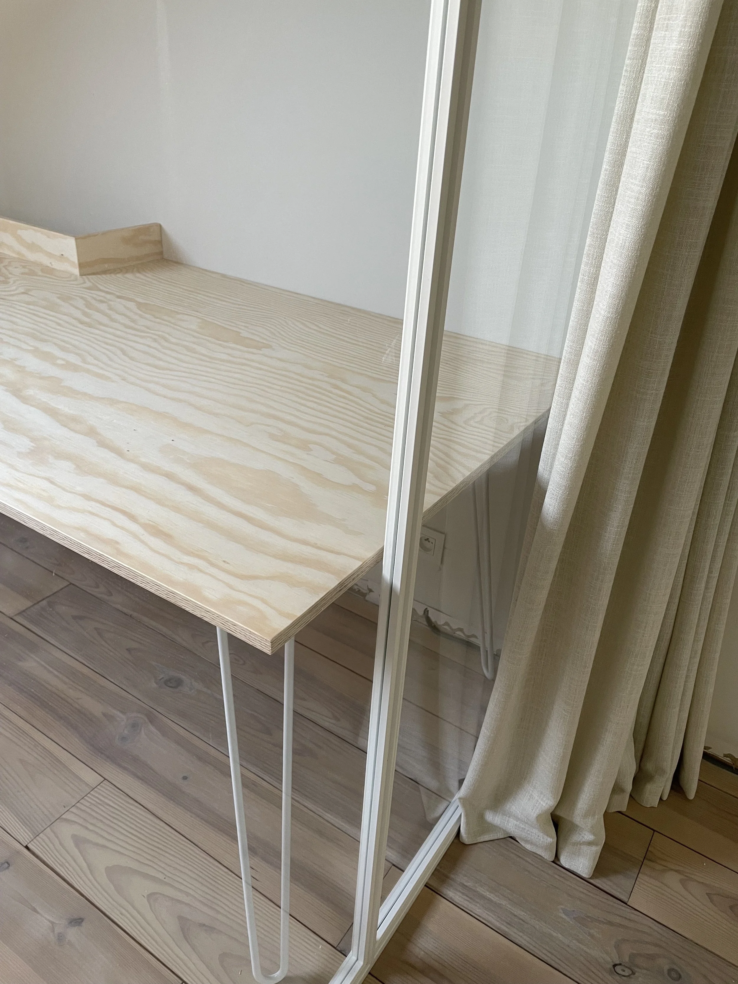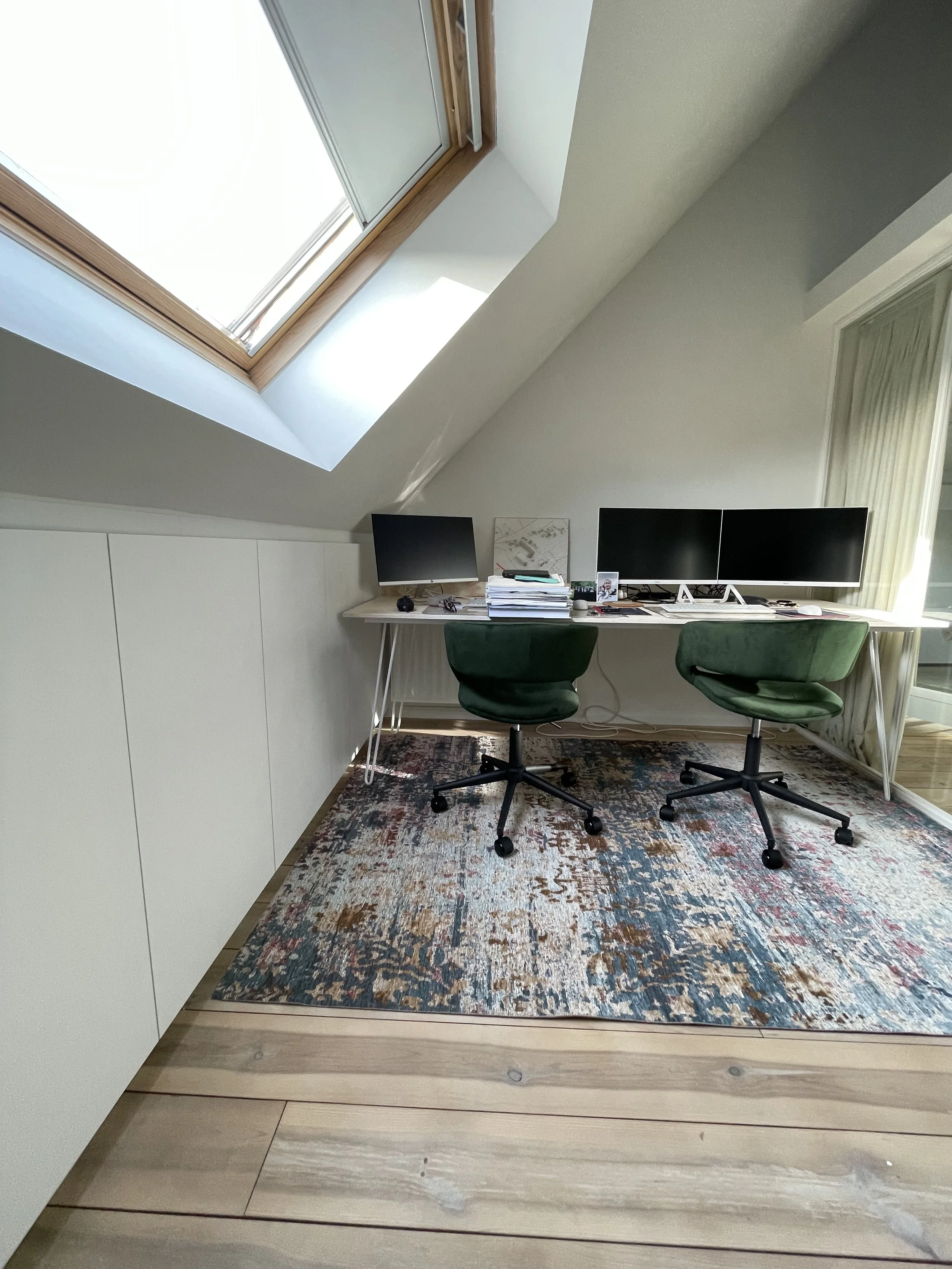 Thuiskantoor met kasten onder het hellend dak en een vrijstaande bureau in pools grenen.
